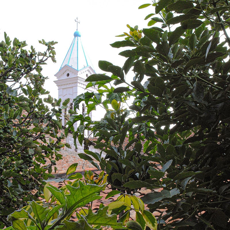 Who would have imagined that behind the white wall, a couple steps from the square, such a lively garden would have blossomed its way up? Yes, good afternoon, your room is upstairs. That is a fig tree, that is a floripondio, that is a capulí. Please make yourself at home and welcome to Cuenca; we will take care of anything you need.